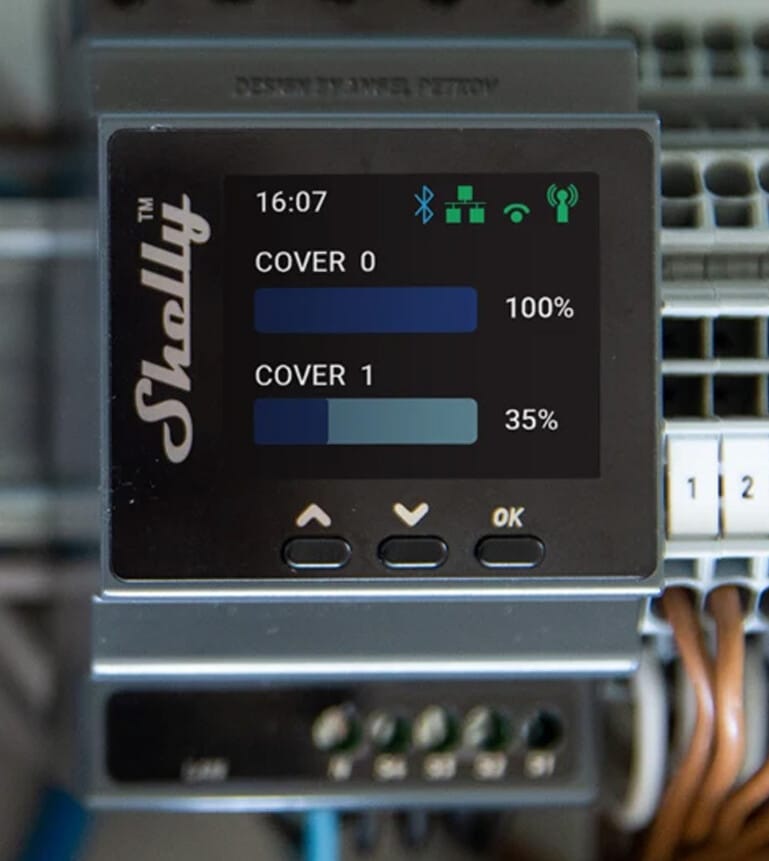 Shelly Pro Dual Cover / Shutter PM provides precise monitoring of the power consumption of both covers.