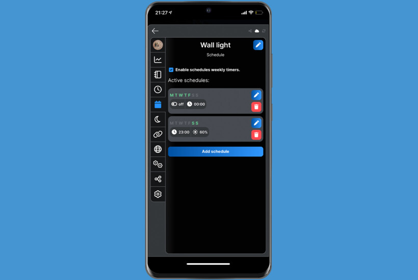 Teach your home how to interact with you best by setting custom schedules based on your agenda. You can set Shelly Plus 1 to turn on the garage alley lights at 7:00 PM on workdays, or set Shelly TRV to increase the temperature in the house an hour before you come back from work, making sure that your home is cozy and welcoming by your arrival.