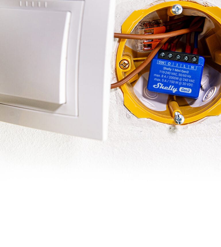 Thanks to its compact size, Shelly Mini 1 Gen3 can discreetly fit within the ceiling rose of your lamp or in jammed wall boxes. Once installed, Shelly Mini 1 Gen3 enables you to effortlessly control your lights or other appliances using the Smart Control App, your preferred platform, or voice assistant. Easily customize your lights according to your daily routine with personalized schedules and save on energy. Set your hallway lights to automatically switch off past your family’s bedtime, ensuring a peaceful night’s sleep. And don’t worry – you can still use your light switches manually to suit the needs of everyone in your home.