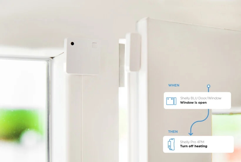 Shelly BLU Door/Window can also contribute to your energy efficiency efforts. By connecting it to other devices, you can automate the adjustment of heating, cooling, or lighting based on the door or window open state. For example, when a window is opened, the system can automatically turn off the heating to conserve energy.